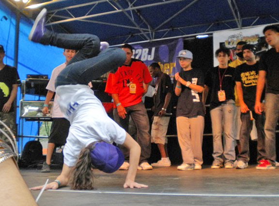 On the other side of the stage, Crazy Legs holds back lil' Bailrok from battling the big boys.
